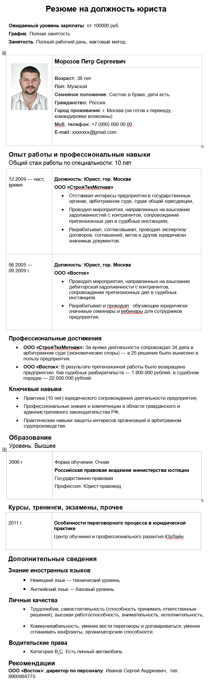 В остальном, резюме юриста без опыта работы ничем не отличается от аналогичного документа, составленного опытным специалистом.